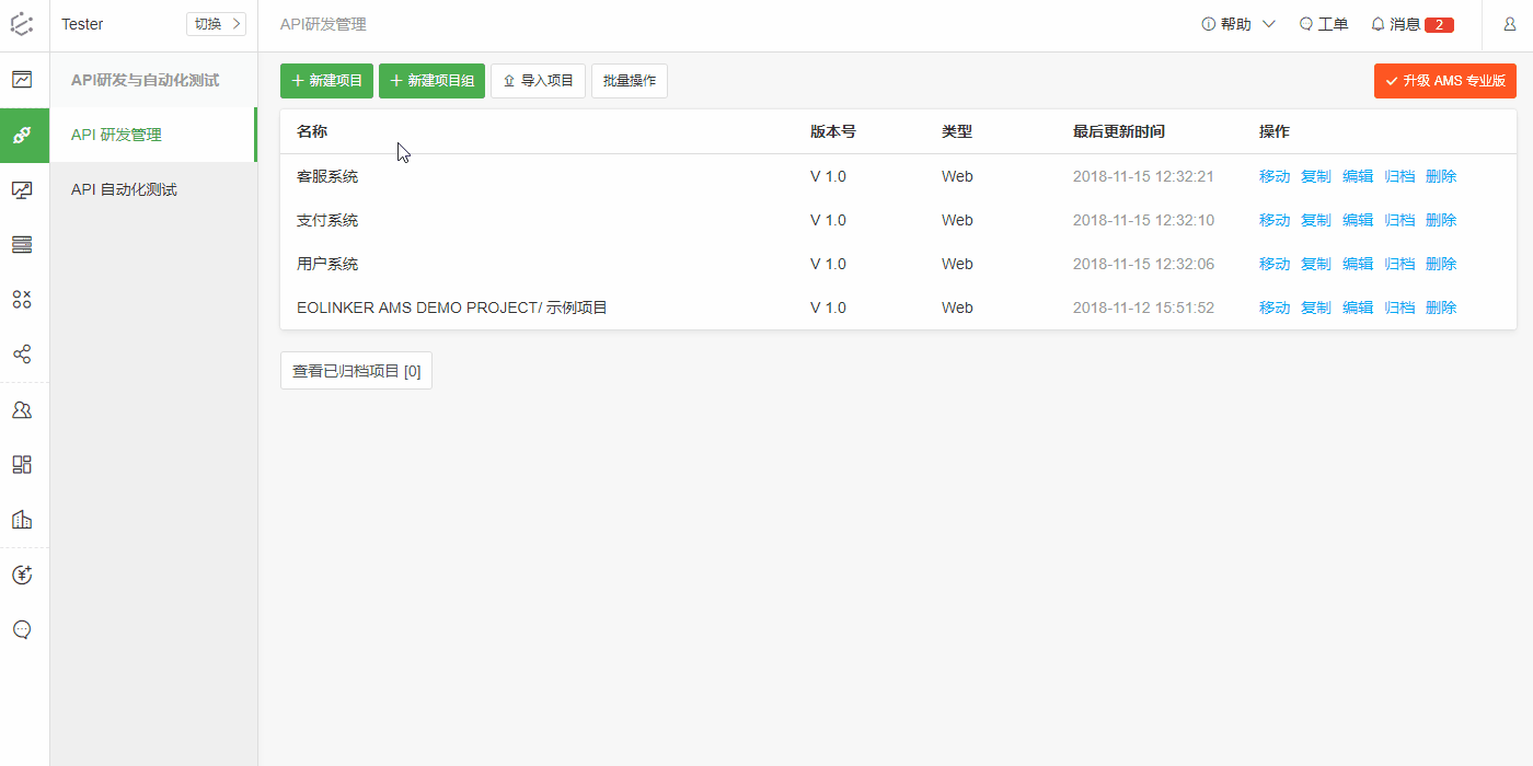 随着项目的不断发展,我们希望能够将庞大的API系统拆分成多个子系统,并且对API文档和测试进行适当的分类,方便研发管理。我们在 EOLINKER AMS 产品中提供了项目分组的功能,你可以通过它拆分庞大的API项目、并且将拆分之后的项目分组归类。